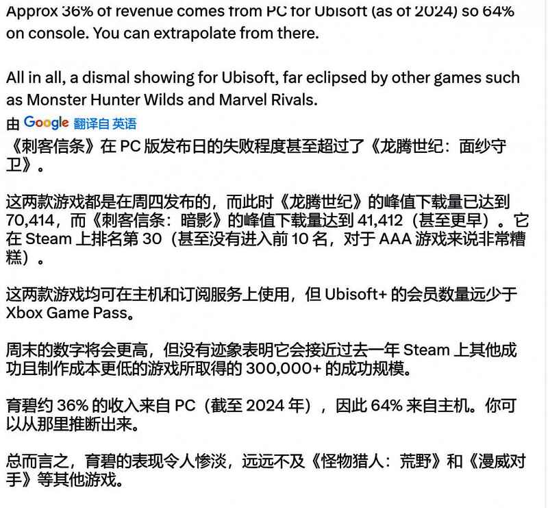 100万玩家并不意味着100万销量,毕竟《刺客信条:影》还上架了自家的育碧+订阅服务。这也同时意味着该作首发当天的销量不到100万。