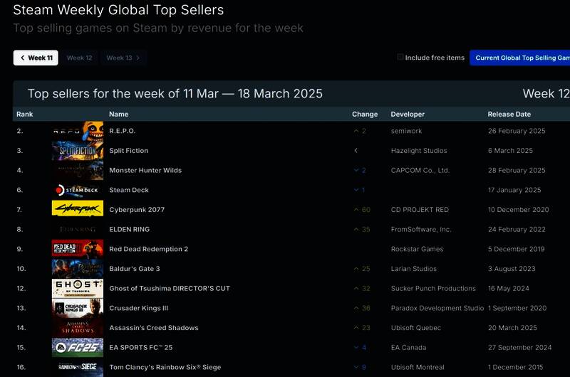 受Steam春季促销的影响,不少老游戏比如《赛博朋克2077》《荒野大镖客2》《博德之门3》《对马岛之鬼》等进入前十。