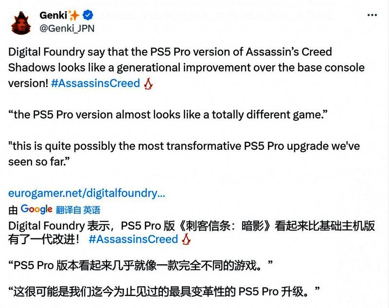 数毛社(Digital Foundry)带来了《刺客信条:影》PS5 Pro版的分析,DF对该作的PS5 Pro版大加赞赏,称其是“这可能是我们迄今为止见过的最具变革性的PS5 Pro升级”。