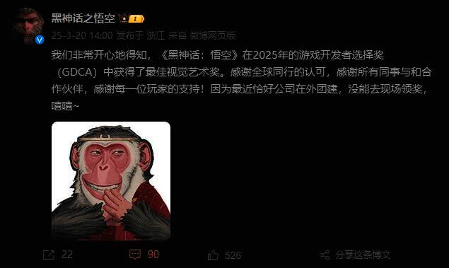在2025年游戏开发者选择奖(GDCA)的颁奖典礼上,国产3A游戏《黑神话:悟空》获得了最佳视觉艺术奖,《黑神话:悟空》官方社媒也发文表示了庆祝,并对因公司在外团建没能去现场领奖,表示了遗憾。