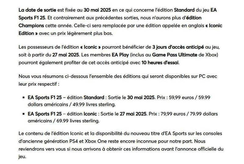 与往年不同,今年的《EA SPORTS F1 25》不会推出冠军版,取而代之的是名为“Iconic Edition”的版本,定价79,99美元,比冠军版略低,预购该版本的玩家可以获得3天抢先体验权,EA Play用户也可以享受10小时试玩的抢先体验权。