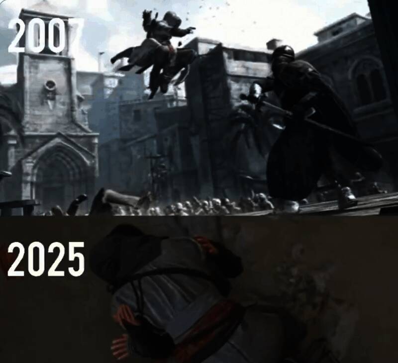 随后有玩家对比了2007年的《刺客信条1》,谁能想到18年后会变成了这样: