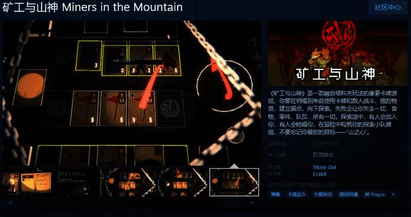 《矿工与山神》是一款融合塔科夫玩法的像素卡牌游戏,你要在坍塌到来前使用卡牌和敌人战斗,搜刮物资,建立据点,向下探索。失败会让你失去一切,食物、零件、队员…所有一切。探索途中,有人会加入你,有人会妨碍你,在冒险中构筑你的探索小队牌组,不要忘记你最初的目标——“山之心”。