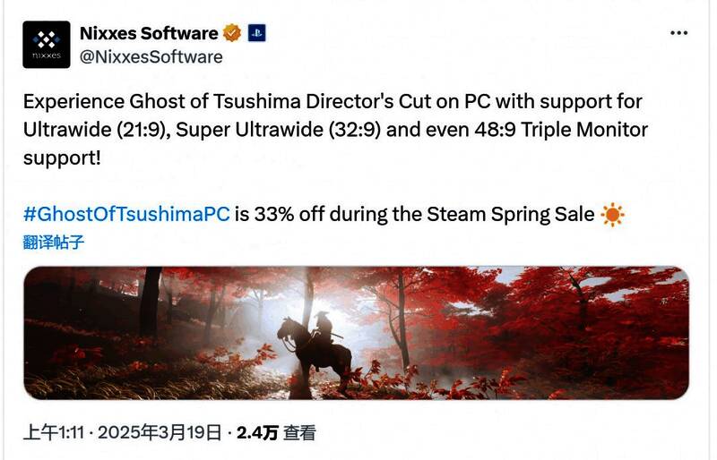 目前正值Steam春季促销季,《对马岛之鬼》PC版移植开发商Nixxes Software官推亲自上场,宣传这款动作游戏。