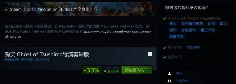 《对马岛之鬼》PC版2024年5月发售,目前正在Steam春季促销中,原价398元,现降价33%,促销价266.66元,为历史最低。