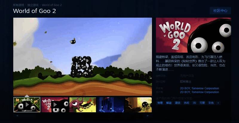 3月19日,开发商2DBOY和Tomorrow Corporation宣布,益智游戏《粘粘世界2》将于今年春季登陆Steam,商店页面现已上线,可加入愿望单,游戏支持中文。《粘粘世界2》是《粘粘世界》的续作,最初于2024年8月2日发售,登陆了Epic和Switch。