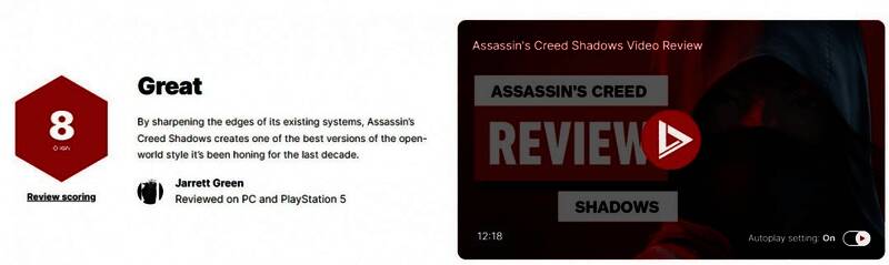 《刺客信条:影》媒体口碑已解禁,外媒IGN为其打出8分好评。IGN认为该作对现有系统进行精雕细琢,打造出开放世界风格的最佳版本之一。