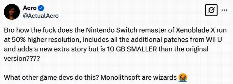 近日玩家Aero发推文称,《异度神剑X:终极版》容量大小为13.5GB。而WiiU原版容量大小为23GB。为什么终极版分辨率提高了50%,包含了WiiU原版所有附加内容,并增加了一个新的额外剧情,但容量竟比原版小了10个GB。Monolithsoft是法师吗?其他开发商能做到吗?