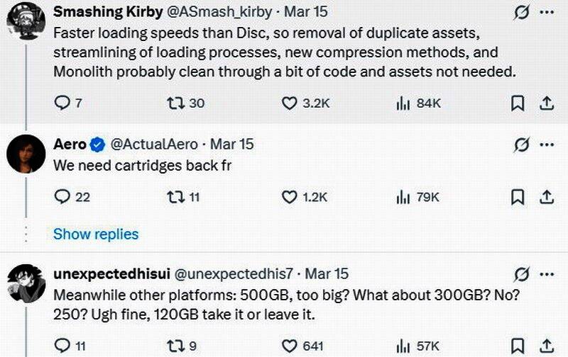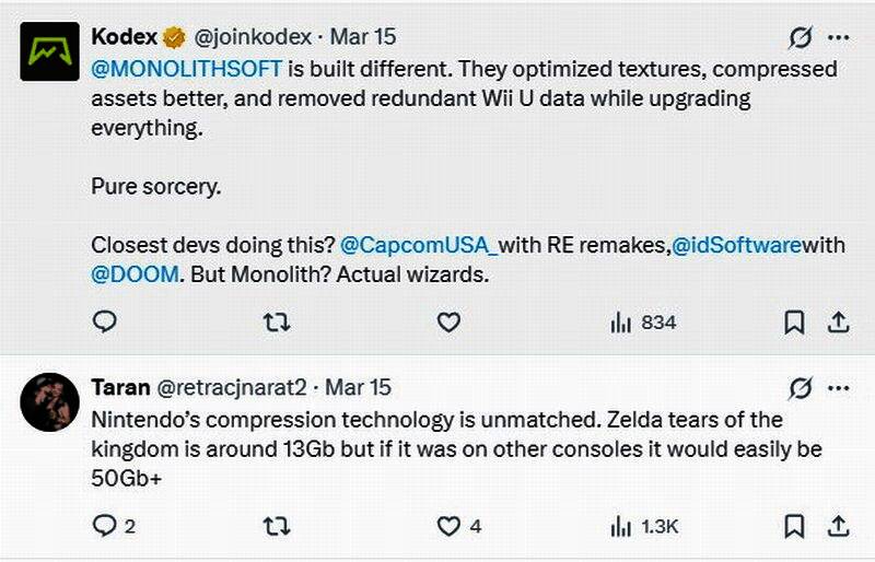 评论区有人表示:“Monolithsoft可能删除了不需要的代码和资产,简化了加载过程,并使用了新的压缩方法。”“优化和压缩显然是一门失传的艺术”“现在的游戏动辄就是100GB以上,希望他们能跟任天堂学学。”“任天堂的压缩技术是无与伦比的,《塞尔达传说:王国之泪》容量为13GB,如果在其他主机上,则很容易达到50GB以上。”