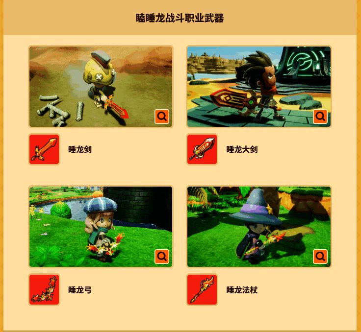 瞌睡龙战斗职业武器:睡龙剑、睡龙大剑、瞌睡龙弓、瞌睡龙法杖;
