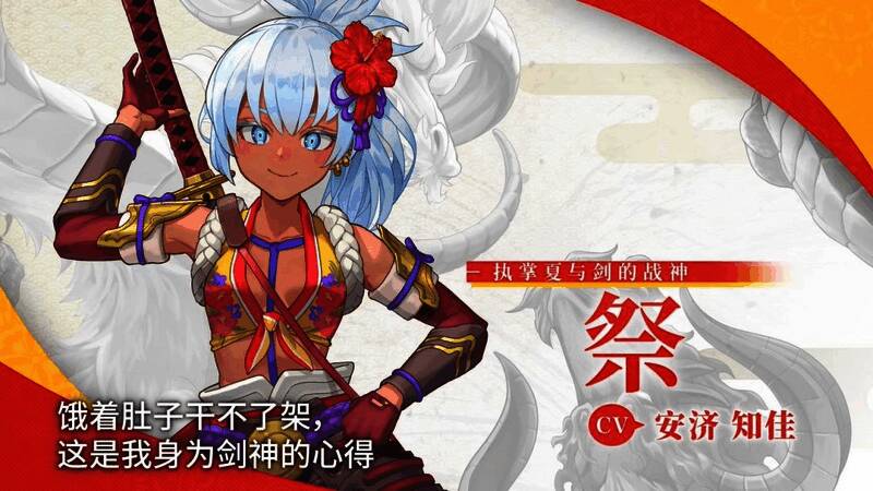 祭是东国执掌夏与剑的神明,性格天真烂漫,喜欢活动身体,活泼又爱玩闹,剑术出神入化,但总是想通过蛮力解决问题。