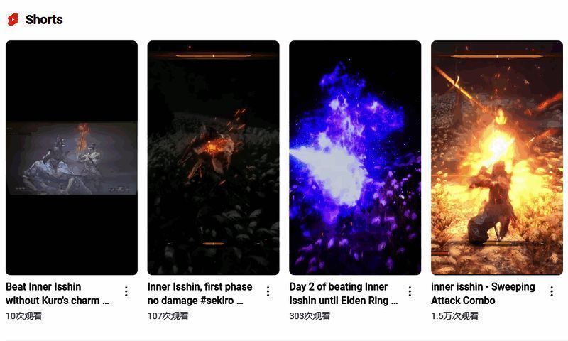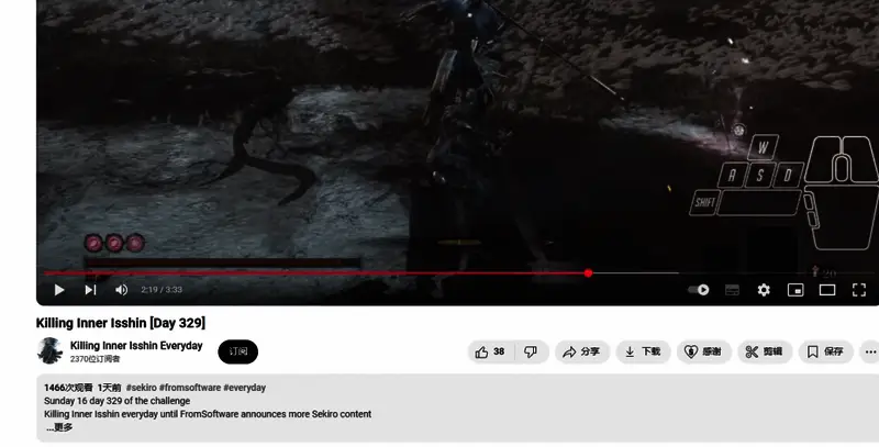 距离2020年11月《只狼:影逝二度》的最后一次更新已经过去了四年多,在这之间游戏几乎没有再要更新的消息。为了催促官方继续更新,油管上一位名叫“Killing Inner Isshin Everyday”(击杀心中的一心每一天)的博主每天都会上传他击败《只狼:影逝二度》中的最难BOSS之一“心中的一心”的视频,至今坚持了330天,每个视频简介中都写着“for more Sekiro content”(“只为等待更多的《只狼》内容”)。