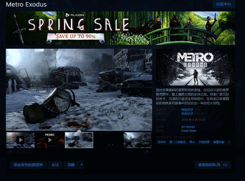 《地铁:逃离》于2019年2月发售,目前正在Steam春季促销中,原价148元,现降价75%,售价37元(史低价为14.8元),支持简体中文。该作获得玩家“特别好评”评价。