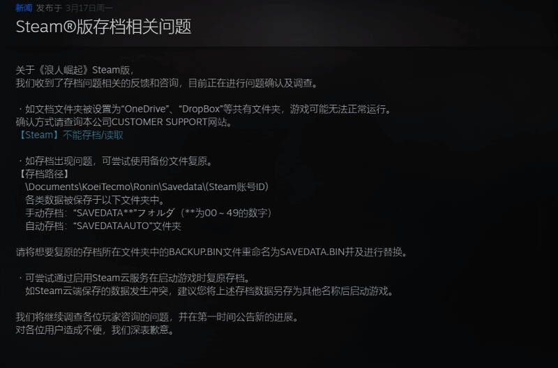 对此,Team Ninja官方X账号发布了消息,称正在调查《浪人崛起》PC Steam版玩家反应的存档问题。该帖子链接到官网支援板块,为玩家提供了解决该问题的潜在方法,包括查找备份保存数据、在保存到Steam Cloud时遵循额外步骤,或关闭Google Drive、OneDrive或Dropbox的文件共享。