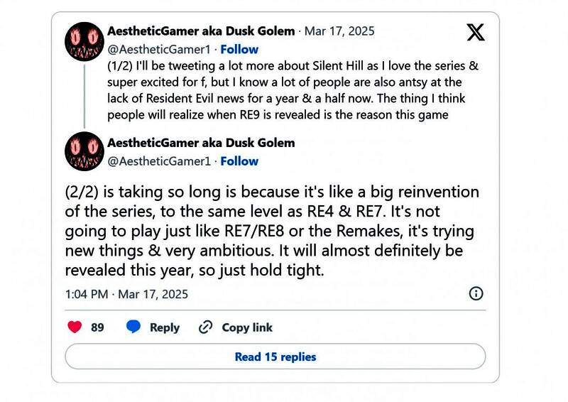 他说《生化危机9》玩起来不会像《生化危机7/8》,或是重制版,而是完全不同的东西,非常有野心。最后Dusk Golem还相信《生化危机9》铁定会在今年公布,所以请耐心等待。