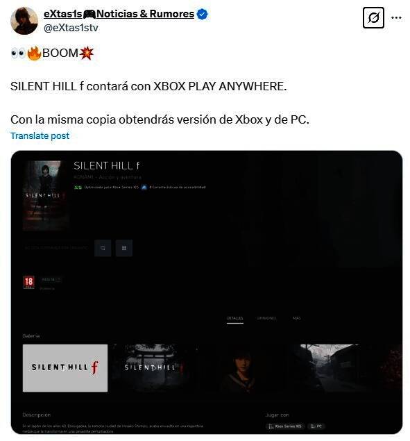 此外据推特主eXtas1stv透露,《寂静岭F》将采用“XBOX play anywhere”模式。也就是说,玩家只要买一份游戏,在Xbox和PC双平台都可以游玩。