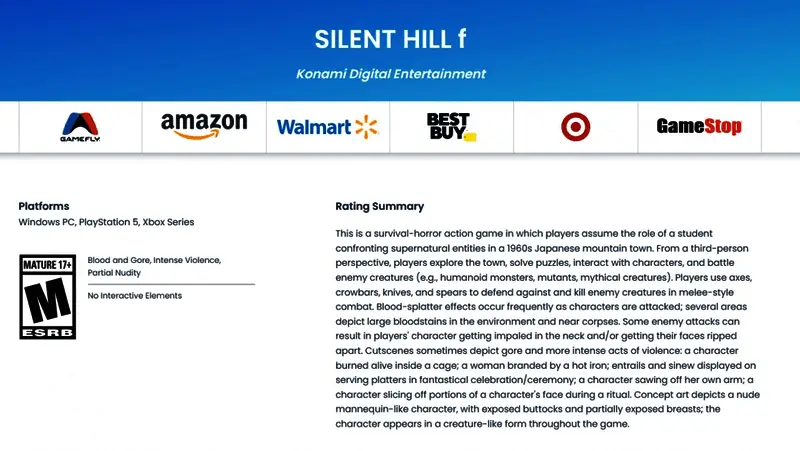 根据ESRB评级页面显示,《寂静岭f》现已通过评级,级别为M(17+成人级),游戏包含血腥暴力、强烈暴力和部分裸露元素。《寂静岭f》预计将登陆PS5、Xbox Series X|S和Steam,发售日期待定。
