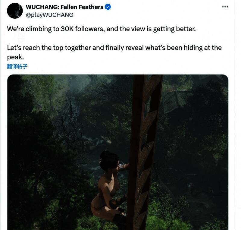 国产动作RPG游戏《明末:渊虚之羽》官推表示,随着账号粉丝即将爬到3万,这一风景正在变得越来越美。同时发布(奖励)了一张女主性感爬梯的截图,“让我们一起登上顶峰,最终揭开山顶隐藏的秘密。”