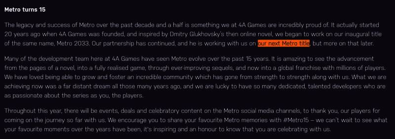 4A Games的许多开发团队成员见证了《地铁》在过去15年中的演变。从一本小说的页面,发展成一款完全实现的游戏,再通过不断改进的续作,如今成为拥有数百万玩家的全球特许经营品牌,这种进步令人惊叹。我们很高兴能够与你们——玩家们一起,培养并壮大一个令人难以置信的社区,这个社区与我们一同不断成长壮大。我们现在所取得的成就,在多年前只是一个遥远的梦想,而我们很幸运拥有这么多敬业且才华横溢的开发者,他们与你们这些玩家一样,对这个系列充满热情。”