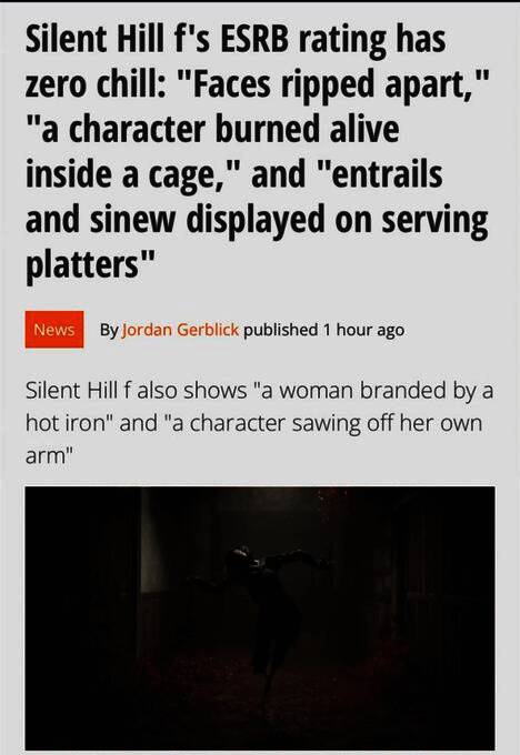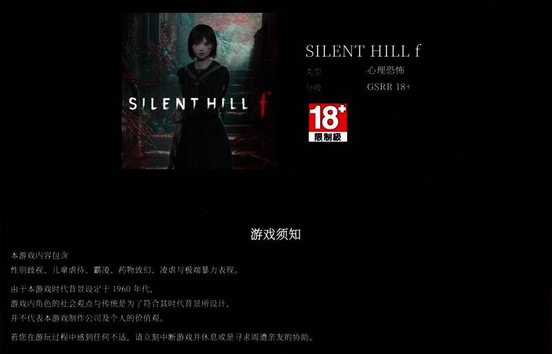 北美分级委员会ESRB表示,《寂静岭f》中有一些场景,敌人的攻击会导致玩家角色“脖子被刺穿或脸被撕开”。