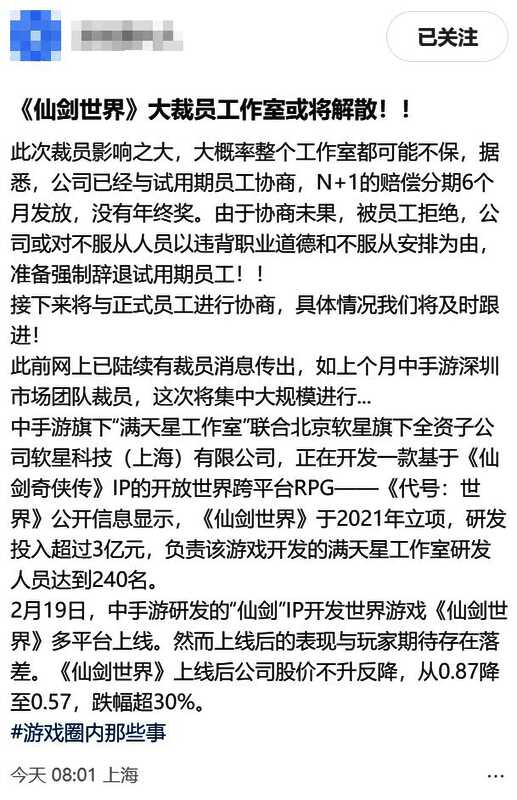 近日网上有消息称,中手游《仙剑世界》工作室大裁员,或将解散。在脉脉和小红书等平台上,有人说中手游这次裁员N+1的赔偿要分期6个月发放,还有人说公司对不服从人员采取了强制辞退措施。