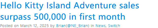 三丽鸥旗下萌宠的幸福虚拟生活体验,官方宣布刚刚与1月31日发售的《凯蒂猫岛屿冒险》销量突破50万,登陆的PC以及Switch和手机多平台特别好评。