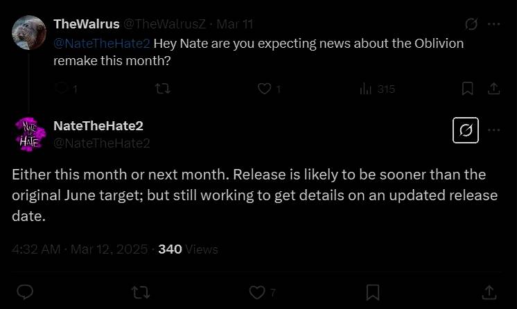 近日知名爆料人NateTheHate透露,《上古卷轴4》重制版很可能会在6月之前推出,最早在4月发布。B社官方将很快正式公布《上古卷轴4》重制版。
