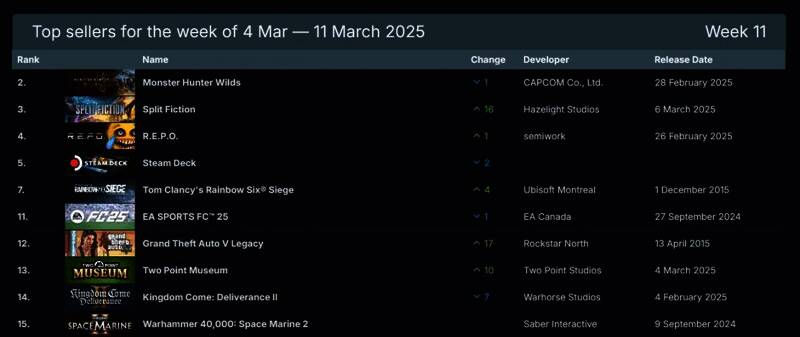 Steam 2025年最新一周游戏销量排行榜出炉(2025年3月4日-2025年3月12日,无免费游戏),本周依旧是《怪物猎人:荒野》登顶,目前该作已达成三连冠,《双人成行》开发商新作《双影奇境》以及《双点博物馆》也登上了榜单,分别位于第二和第八。