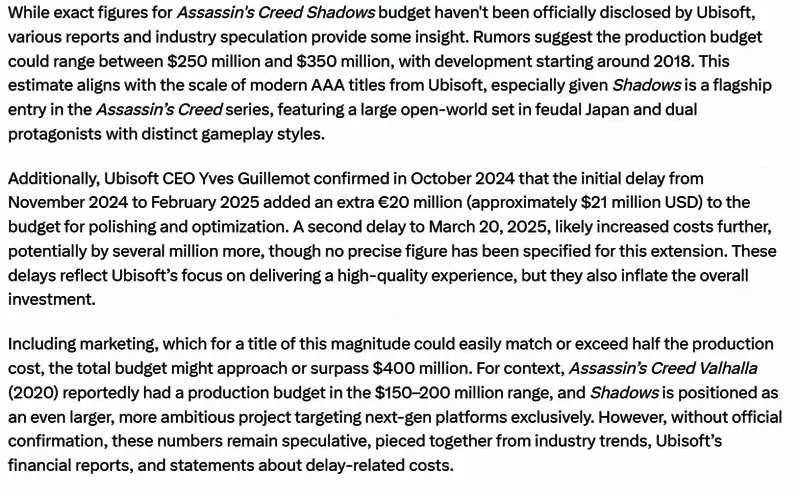 《刺客信条:影》第一次延期(从2024年11月延期到2025年2月)导致预算成本多了2100万美元(用于打磨和优化),第二次延期(延期至3月20日)又增加了几百万美元的成本