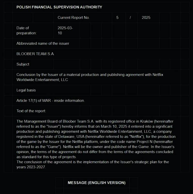《寂静岭2:重制版》开发商Bloober Team和网飞合作,正在为后者开发一个新项目,代号Project N。由于《寂静岭2:重制版》的大获成功,此前Konami已经和Bloober Team续约,继续保持合作,开发一个新游戏。
