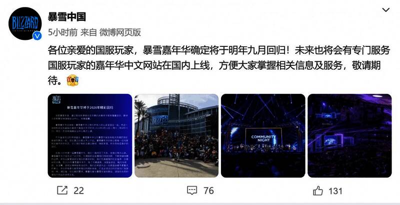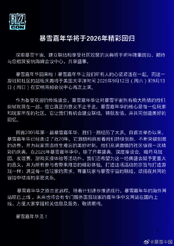 暴雪官宣,今年再次没有暴雪嘉年华(BlizzCon)活动,但会在2026年9月12日-13日回归。