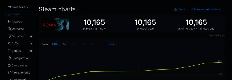 《浪人崛起》PS5版2024年3月22日发售,马上就要一年了。这两年来,索尼之前的第一方PS5游戏再登陆PC就已经展现了颓势,买账的PC玩家越来越少,更何况是光荣的第三方游戏。所以,光荣的《浪人崛起》PC版在优化这么差的情况下,还能突破万人,也算是很不错的表现了。