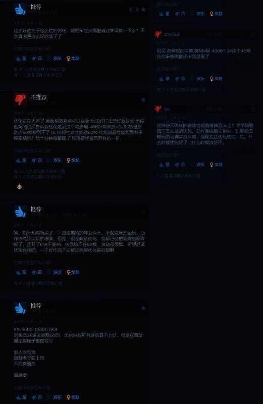 对于优化,很多评论玩家表示,即使是画面差点,但只要玩法好,打击感好,就能接受。但没想到优化差到了这个地步:RTX 4080S高画质+DLSS质量居然连60帧都到不了,DLSS超性能才能稳60帧,简直和隔壁怪猎荒野有的一拼……
