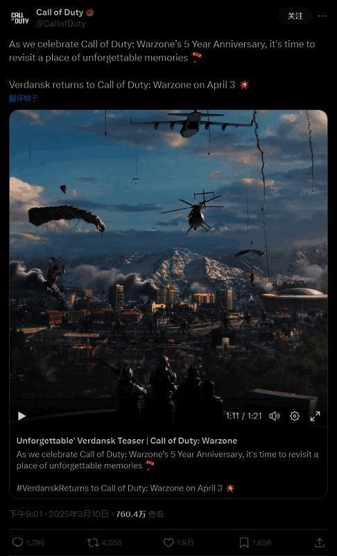 在社交媒体上官方写道:“在我们庆祝《使命召唤:战区》5周年之际,是时候重温这个令人难忘的地方了。”