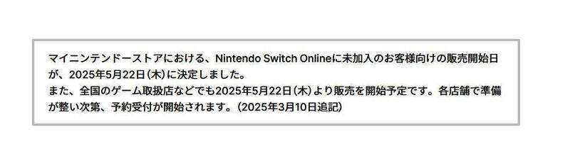 3月10日,日本任天堂宣布,针对未在My Nintendo Store订阅Nintendo Switch Online的客户,任天堂Alarmo闹钟公开销售定于5月22日开启,届时Alarmo闹钟将在My Nintendo Store和日本其他游戏商店不限量发售,各家商店将在准备完成后开启预购。