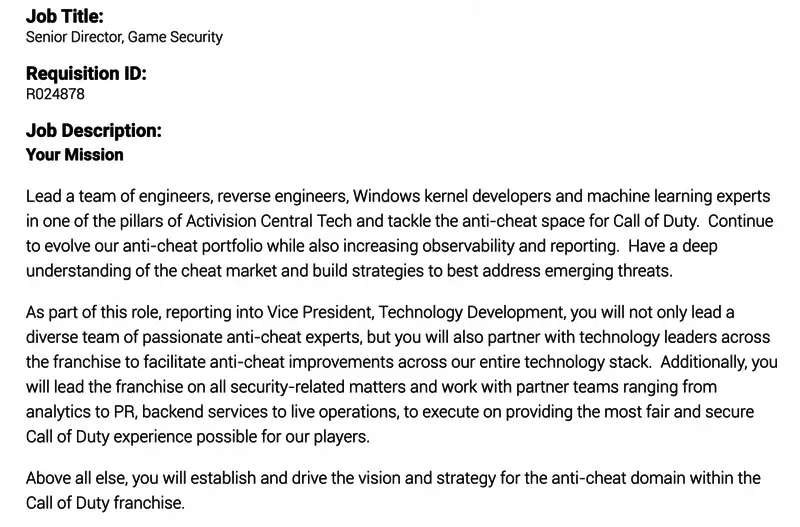 外媒CharlieIntel发现,动视发布了一则招聘广告,寻找一名高级游戏安全总监。职位提到,这名安全总监将“领导一个由工程师、逆向工程师、Windows内核开发人员和机器学习专家组成的团队……解决《使命召唤》的反作弊问题”。