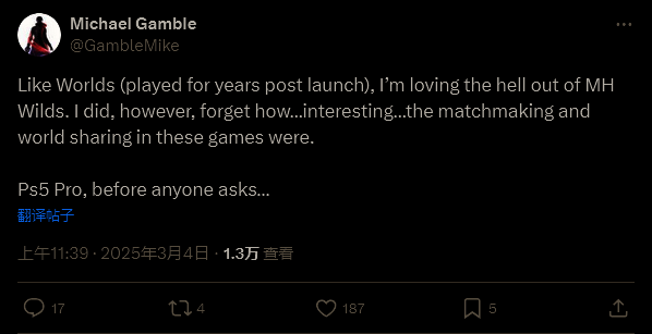 开发商 BioWare 负责人,《质量效应》总监 Michael Gamble 最近就在社交媒体上“吐槽”了这一点。他写道:“酒相《世界》(发布后玩了好几年)一样,我非常喜欢《怪猎:荒野》。然而,我确实忘记了这些游戏中的匹配和世界共享机制多么‘有意思’。”