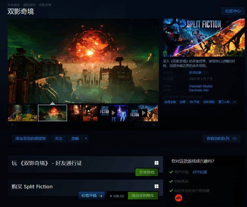 《双人成行》开发商新作《双影奇境》现已正式解锁发售,Steam国区198元,支持简体中文和中文配音。该作首发立刻获得玩家“好评如潮”评价。目前Steam上共有567篇评价,好评率高达96%。