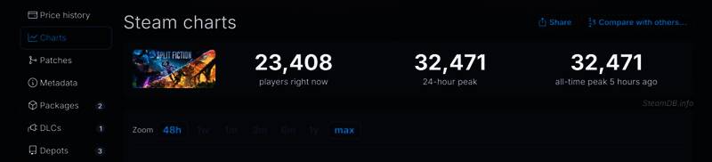 根据SteamDB反馈,《双影奇境》Steam首发在线峰值为32471人,当前在线23408人。
