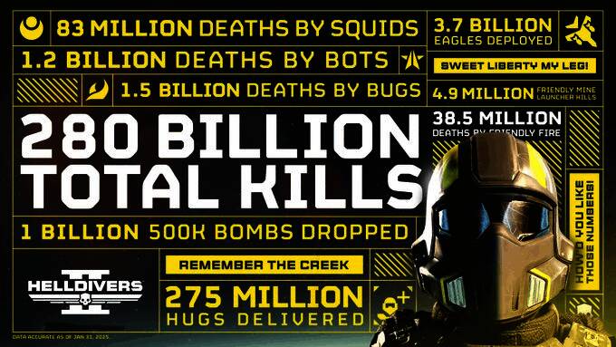 开发商 Arrowhead 日前在社交媒体上分享了《绝地潜兵2》的一系列数据。这款游戏于 2024年 2 月 8 日推出,至今已经过去了一年。