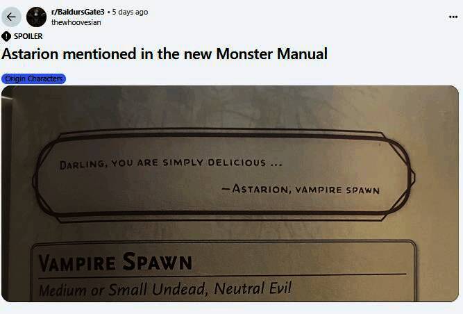 近日名为“thewhoovesian”的reddit用户在官方最新的2025版《怪物手册》中,惊喜的发现了《博德之门3》人气角色阿斯代伦的名字,以及他的经典名句:“亲爱的,你真是太美味了……(Darling, you are simply delicious…)”