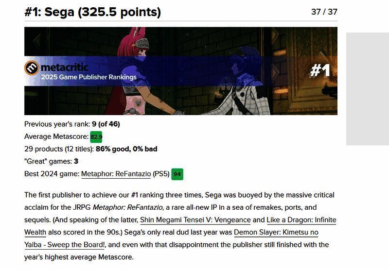 1)世嘉(325.5分) – 82.9 (去年:第9名)最佳游戏:《暗喻幻想:ReFantazio》94分