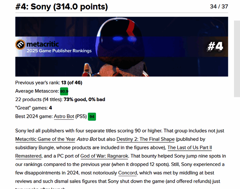 4)索尼(314分) – 80.9 (去年:第13名)最佳游戏:《宇宙机器人》94分