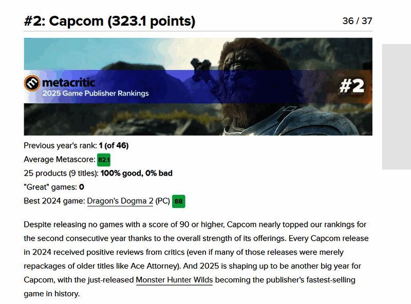 2)卡普空(323.1分) – 82.1 (去年:第1名)最佳游戏:《龙之信条2》88分