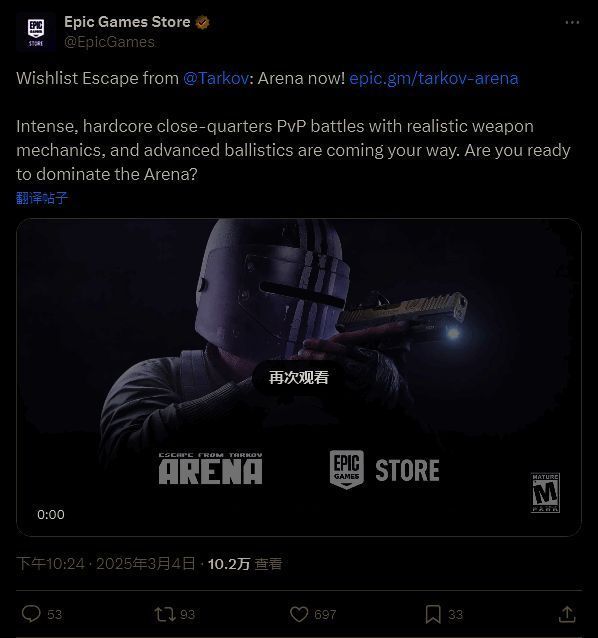 Epic 游戏商城官方社交媒体于早些时候宣布,由 Battlestate Games 开发的热门硬核撤离类第一人称射击游戏《逃离塔科夫》的衍生作品《逃离塔科夫:竞技场》将登陆 Epic 游戏商城。