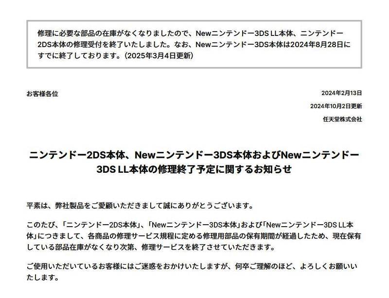 截止到目前,任天堂已经全面停止了北美和日本地区的3DS和2DS游戏机维修服务。