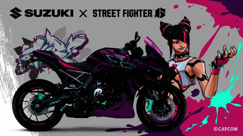 铃木Suzuki和卡普空合作推出了一款《街头霸王6》中韩蛛俐风格的摩托车,但该摩托车不会进行出售,仅用于展示。