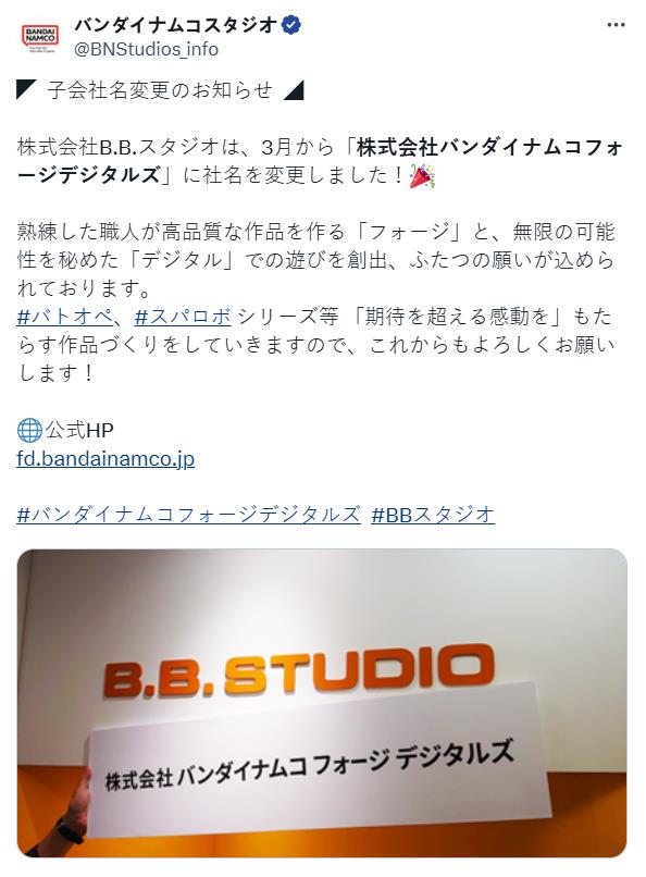 3月4日,万代南梦宫娱乐旗下的B.B. Studio工作室宣布,他们现已更名为万代南梦宫Forge Digitals,该工作室曾开发过《超级机器人大战》系列、《机动战士高达:激战任务2》和《机动战士高达SEED:战斗命运 重制版》等多款游戏。