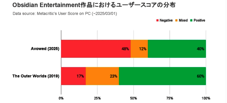 ·玩家列举了黑曜石工作室的作品,比如《天外世界》,在M站的评分并不是很“统一”,截止最新数据显示,60%好评、17%差评,剩下的23%则是难以褒贬不一。