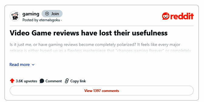 热门游戏论坛Reddit近日一则新话题引发热议,居然收获1400件以上的回帖,话题就是游戏评测越来越不靠谱,因为同一游戏经常被评神作和粪作,个人不玩根本不清楚好坏。